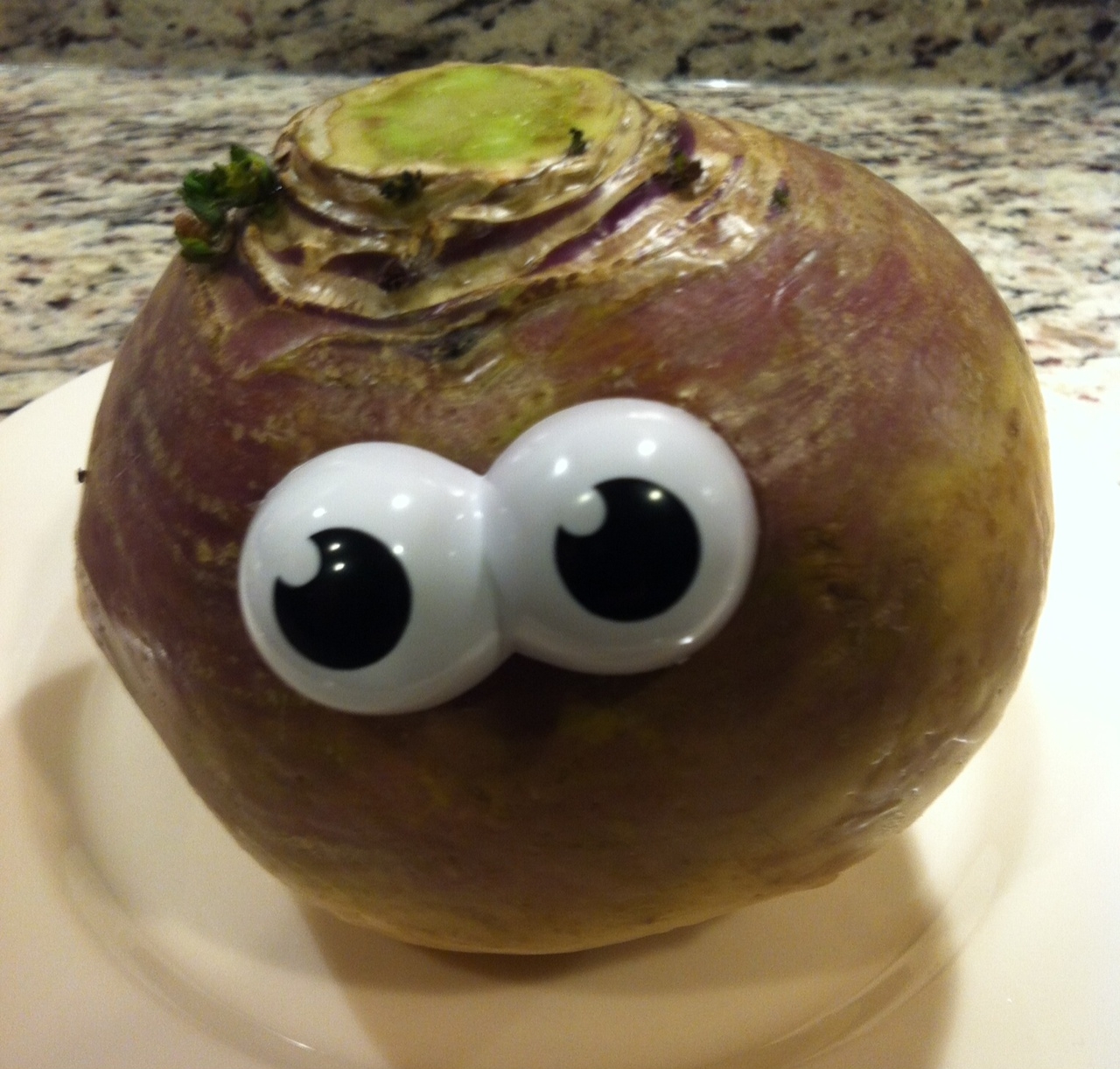 But a rutabaga. I do like the word. Rutabaga. Rutabaga. Rutabaga. It’s fun to say. Go ahead. Try it. See? And I’m not the only one. “Rutabaga is repeated over and over again in the chorus of ‘Call Any Vegetable’, a famous song celebrating vegetables by Frank Zappa and the Mothers” (Webster’s Online Dictionary).