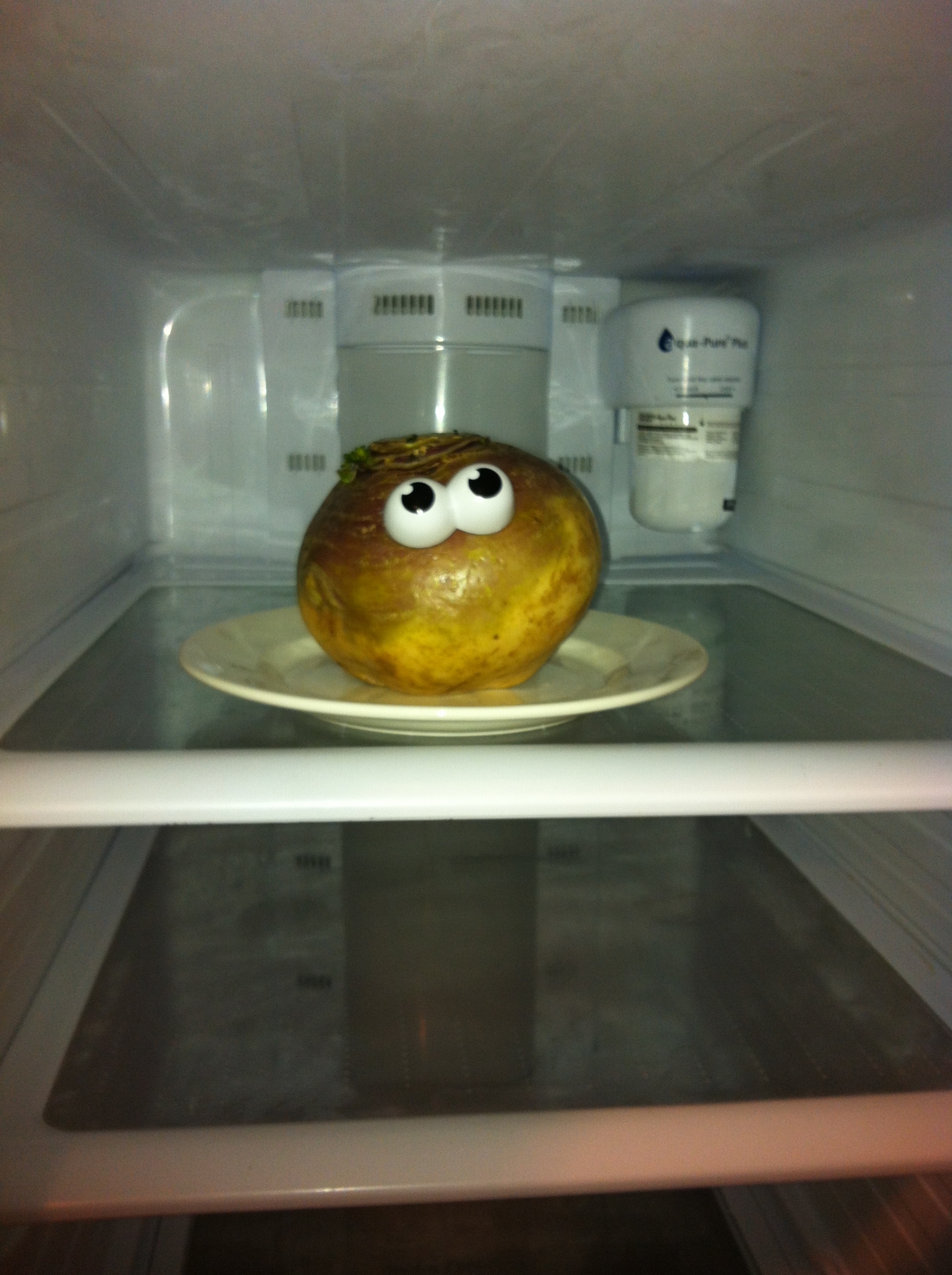 On one evening, Amelia was out and I was famished. I headed for our gleaming cold-environment sustenance repository and opened the door. There, on the center shelf, evidently enjoying its solitude, was one rutabaga. And I named it Sam.