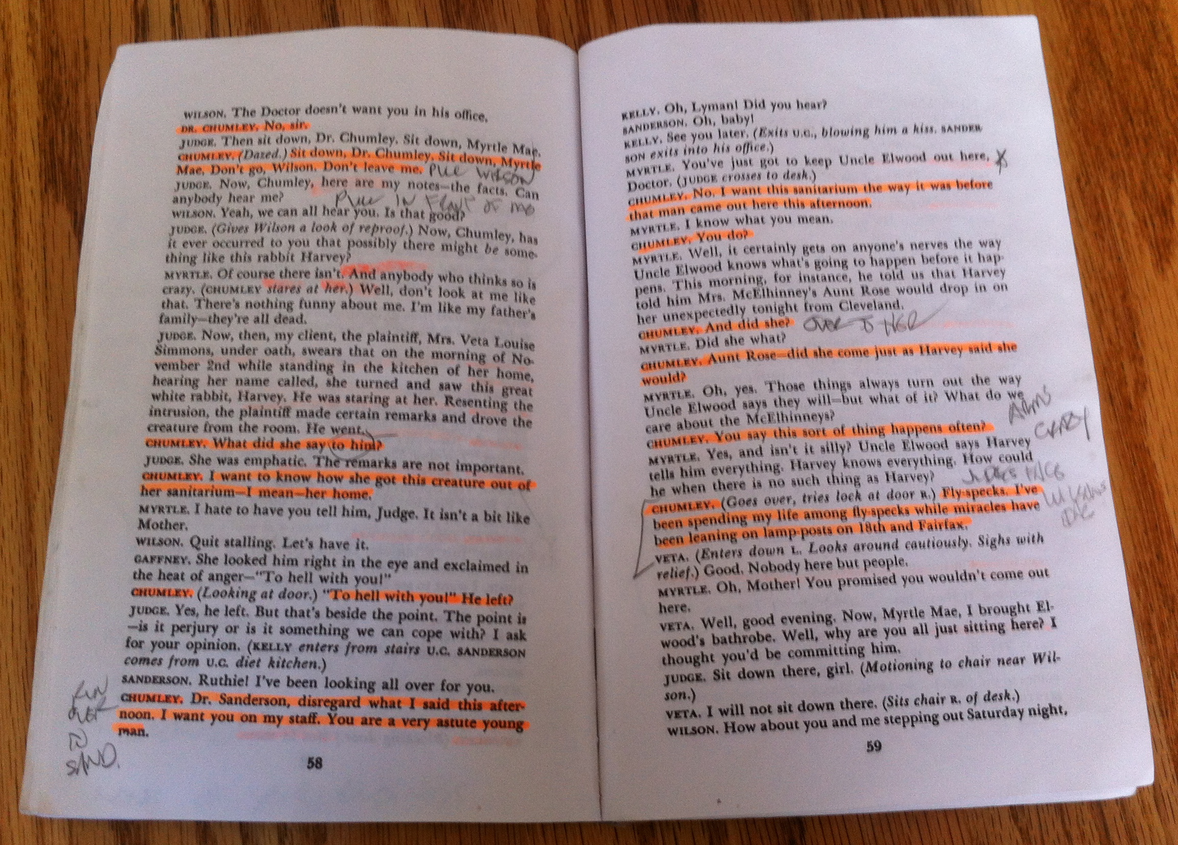 I’ve been thinking a lot about scripts lately. For much of this year, one script or another has been my near-constant companion. First it was Harold Pinter’s short “Precisely” script then the very long “After the End of the World” script by Peter Barnes. And now, it is Mary Chase’s funny and complex “Harvey” script. Yet in a broader sense, I live by scripts. My very life has a script. Or it had one. And I might be just as prone to wandering off that thing. We’ll get to that.