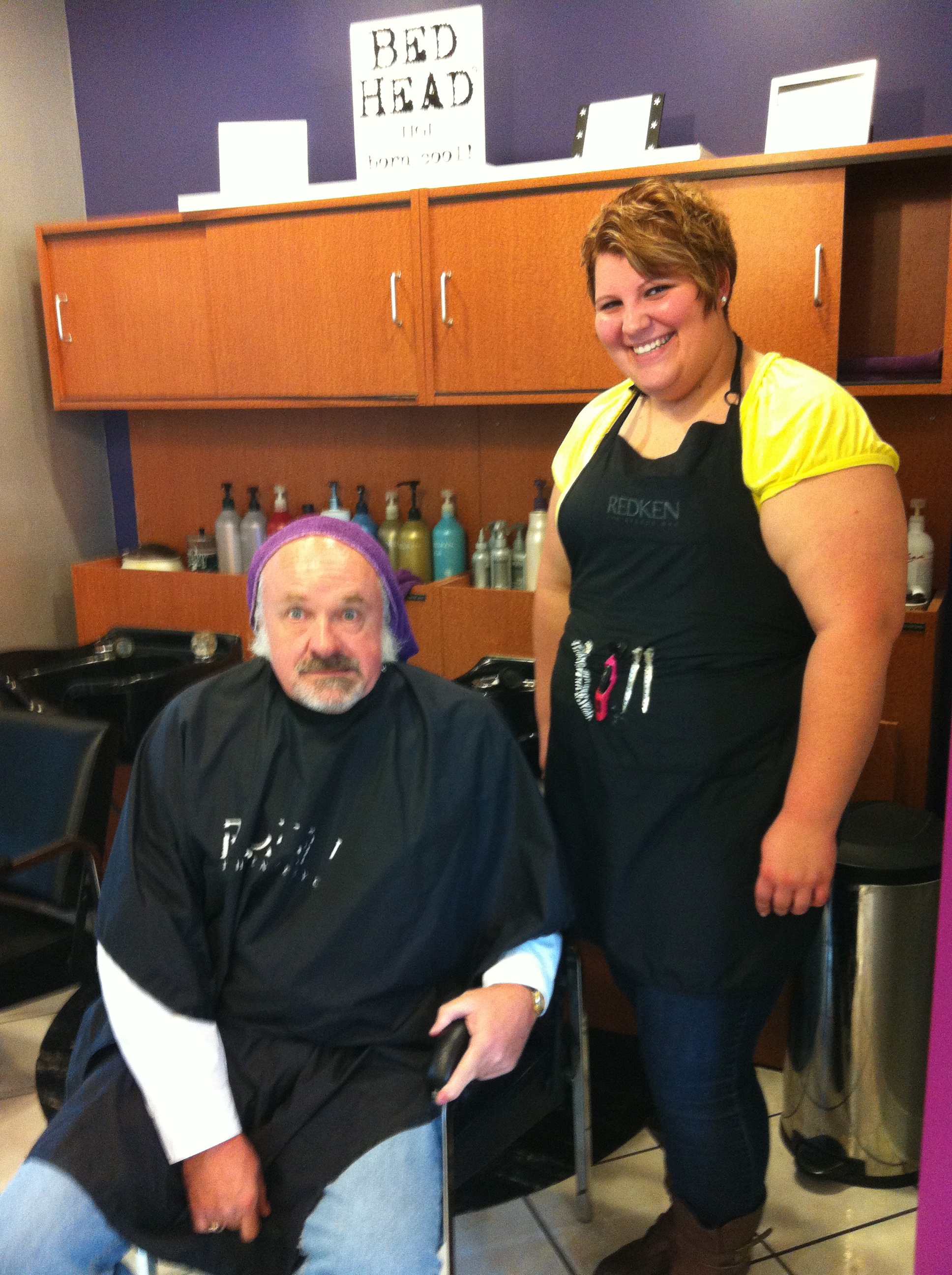 You know the drill. One girl shampooed my hair. What? That’s never happened before in my whole life. Well, maybe my momma washed my hair when I was an itty bitty baby and my momma she rocked me in that cradle in them old cotton fields back home but that’s different. Always just ran the bar of Dial over my own head, thank you. Later, when I became wealthy, I did move up to Suave Ocean Breeze. I didn’t really need shampoo…just kind of a controlled opulence. But it left my hair feeling so soft and manageable. See, I can adapt. Shampoo Girl tilted my head back into a bucket and soaped it all up and hosed it all down. It was sort of like some kind of portable baptism for evangelicals on the go. Then she stuck a purple towel on my head and just left it there. Can this get any more bizarre? I think she was as uncomfortable with me as I was with her. Fair enough. But I, Ali Baba the Purple Sheik, had already washed my hair that morning. Oh well. I’m in this thing now. Can’t be running around mistaken for Cookie the Clown.