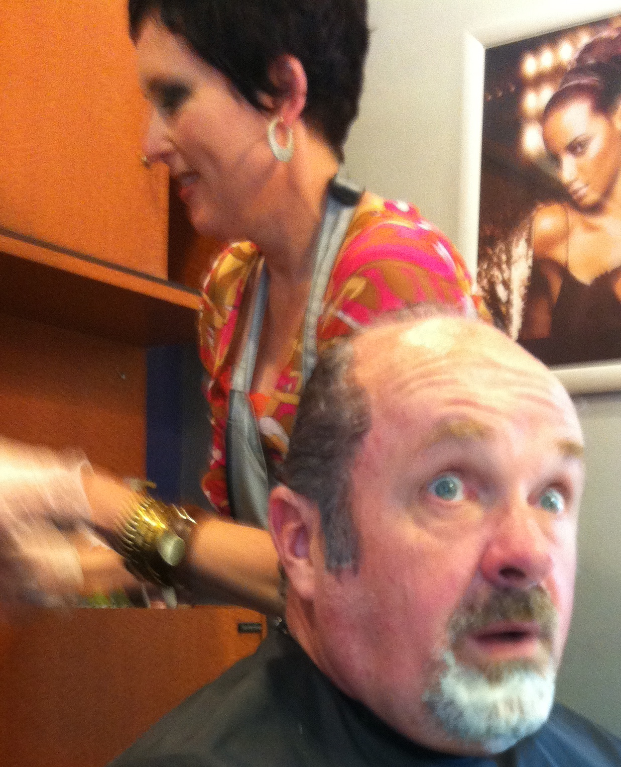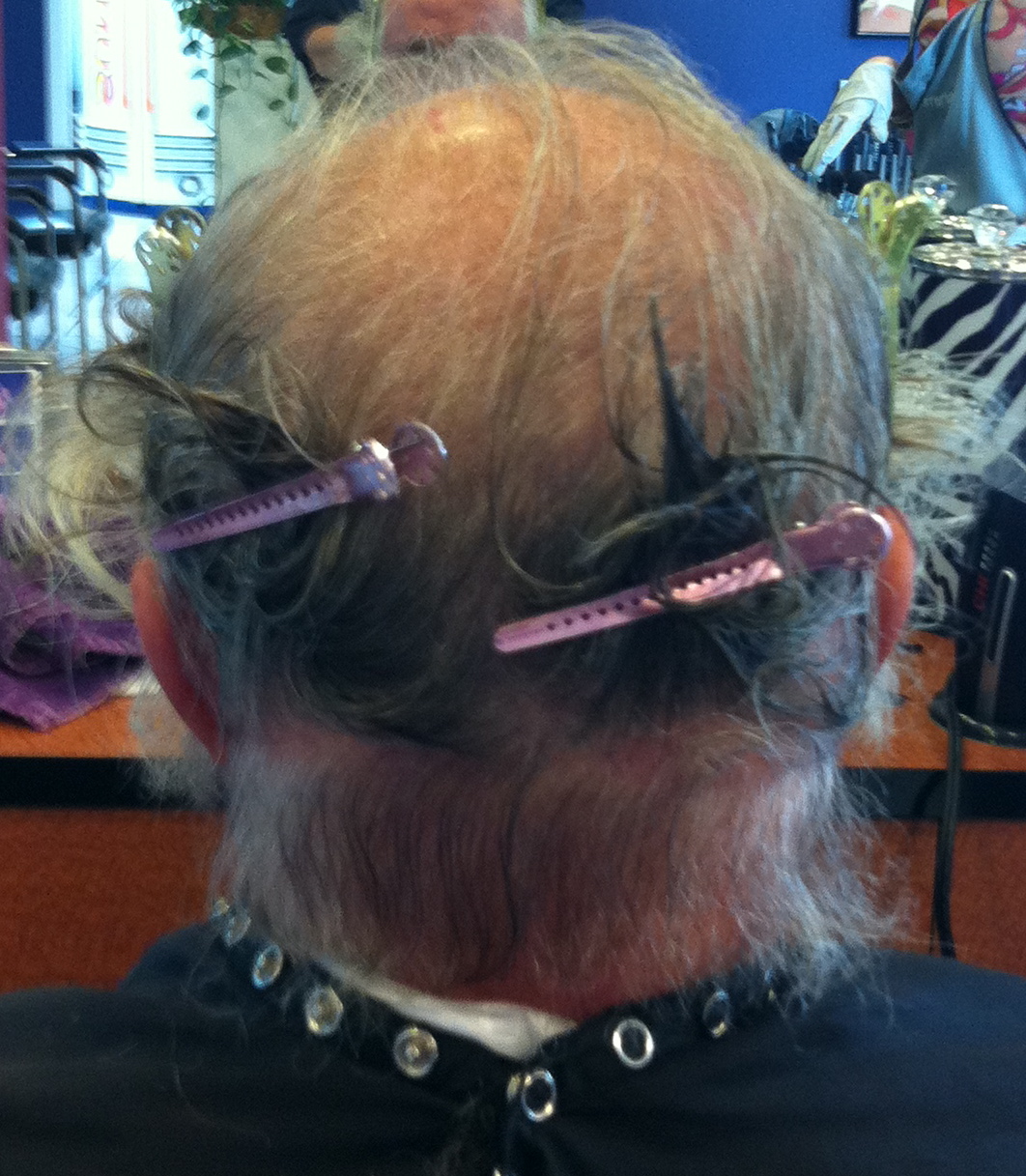 The rest was a blur. Never did figure out what those metal clips attached to my head were for. I looked just like Darth Vader with his helmet removed. Or maybe Frankenstein about to get a much-needed shock therapy power jolt right in the noggin. Whatever it was, others in the salon found it entertaining. Glad to oblige. I was busy though. Busy thinking what I could still do to shake things up a bit. You know what’s coming. Yes, I did it.