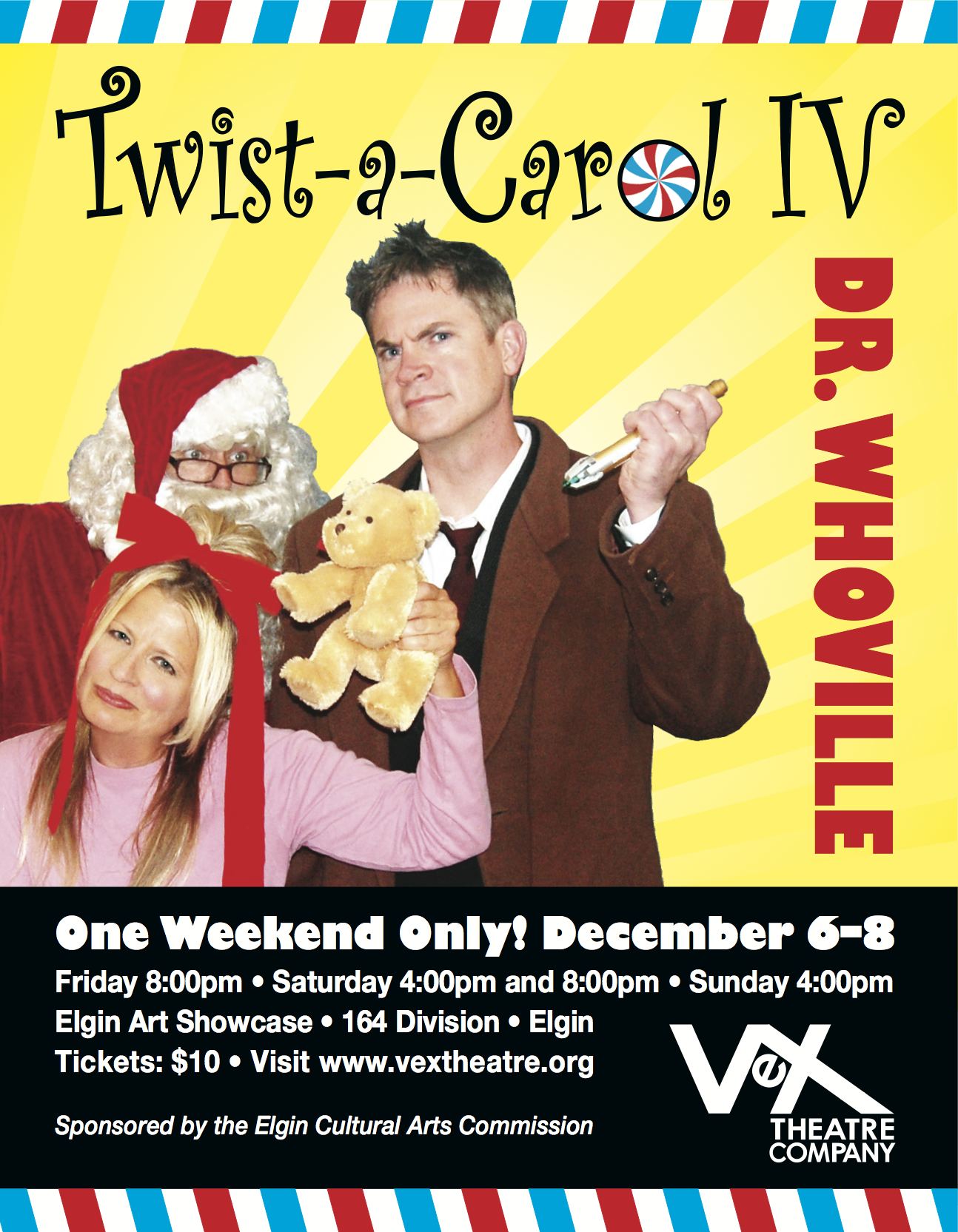 Never say never, I guess. After deciding when the “Harvey” run ended that I would not seek another acting role this year, one sought me. Turns out two friends I met earlier this year in the “After The End Of The World” play in Elmhurst have their own Vex Theater Company in Elgin, Illinois. Rich, my director in the “Precisely” play and Cathleen Ann, playwright of the “Castle” play invited me to join the cast for their “Twist-A-Carol IV” a series of skits with a somewhat less than serious take on Christmas.