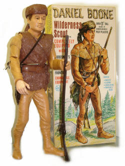 Yep, I ran around in a coonskin cap carrying my Daniel Boone lunch box. An incredible buckskin leather fringed coat was a special Christmas present from my mother when I was nine. My Marx Daniel Boone 12” tall action figure (certainly no doll!) was one of my most prized possessions as a kiddo and one of the things on a shelf in my home today that continues to make me smile.