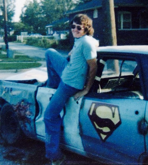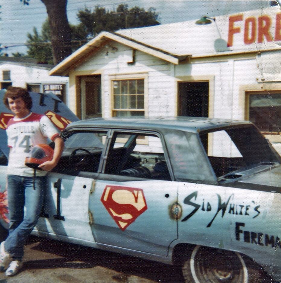 Once I was legally qualified, we got to work on the car. Prepping it was hilarious fun, as we “removed” all glass and chrome (read “bust it out with extreme prejudice”). We got acquainted with the shop welder as we welded all doors closed. Under the Supercar we crawled to re-locate the gas tank into the area formerly occupied by the removed backseat. Grabbing a hacksaw, off came the mufflers (not a race requirement then, but we wanted it to be loud!). The battery joined the re-located gas tank. All work was done by me and my pediatric pit crew, not a mechanic among us. Now it was time for my vision for how the car would look. Another wave of delight washed over us as we painted on Superman logos, flames, “Sid White’s Foreman Motors” signs, my name under the driver door, racing numbers, and the names of my pit crew on the side.