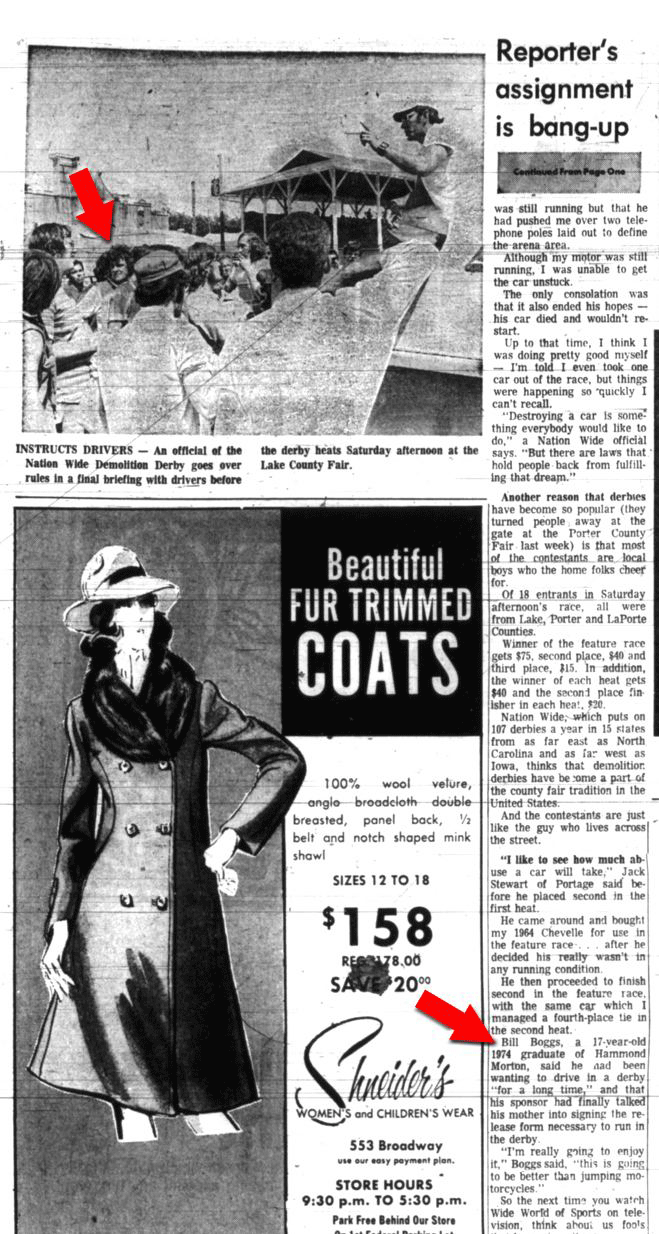 This week, with help from the “Ask a Librarian” link on the Lake County Public Library website, I found one of the articles written about my derby. The August 13th, 1974 Gary Post-Tribune story is included here. I marked my picture and my brief interview in it.