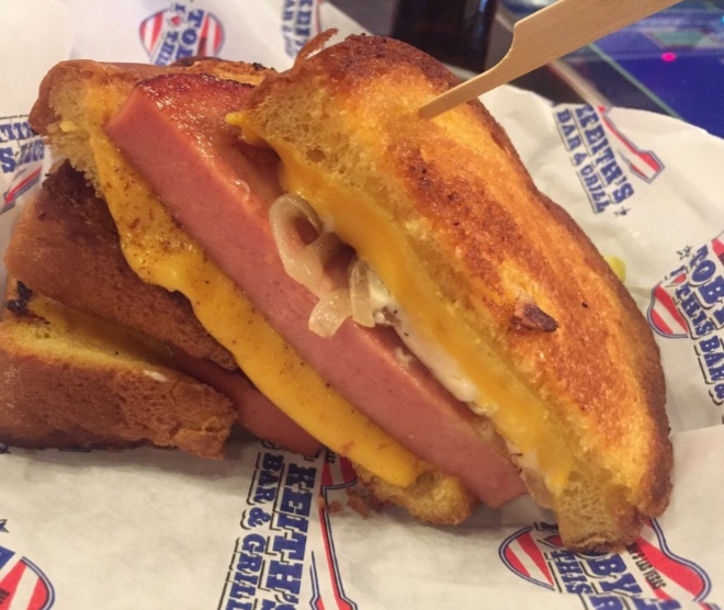 The Fried Bologna Sandwich (the menu name). There is delicious and then there is surprise delicious. Surprise delicious like the time I returned to Marine Corps Base Hawaii after being home on leave. Waiting for me there was a Milky Way cake my mom made for me. Surprise: Cake in the mail. Delicious: My first Milky Way cake, which became my all-time favorite cake. Double good. I was surprised to find a fried bologna sandwich on the menu and then I found it absolutely delicious. Double good. Nothing fancy, “Toby’s Favorite” was just a big pile of thick-cut fried bologna with onions, American cheese, and genuine Miracle Whip dressing on grilled garlic toast. Krystal Keith, Toby’s daughter, offered this, “It has always been my dad’s favorite sandwich, therefore naturally was going to be a feature on the menu at his restaurant chain,” she adds. “This isn’t your typical bologna sandwich. This griddle creation tops the list as the most ordered menu item at each and every I Love This Bar & Grill location.