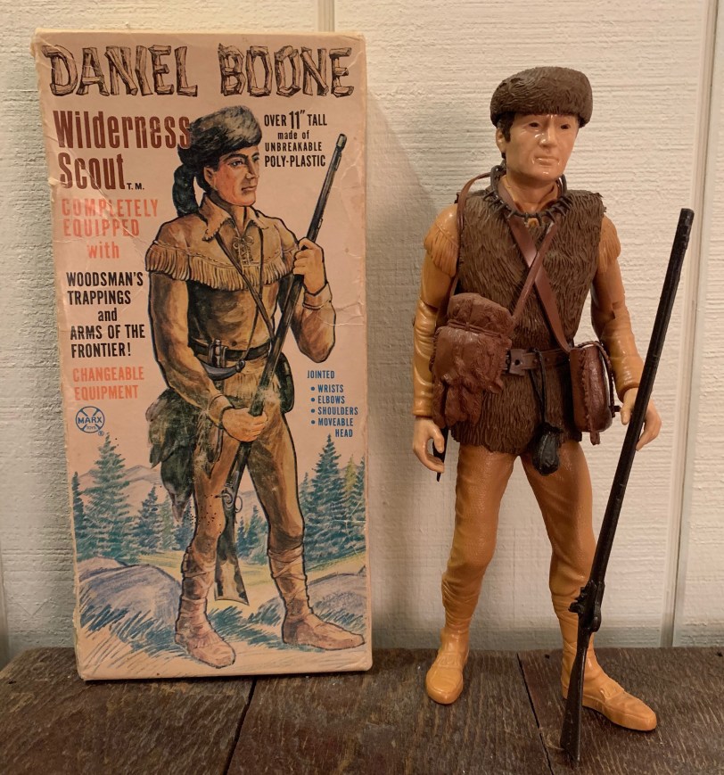 Daniel Boone. “What a Boone, what a doer, what a dream comer-truer was he,” so went the theme song from the “Daniel Boone” TV show. I remember the day I got the 12” tall Marx Daniel Boone action figure, at a 10-cent store in downtown Ashland, Kentucky. I was eight. Hasbro had their 12” G.I. Joe. This military Joe was a hit, so other toy companies scrambled to offer something similar. Marx tried the Old West route, and one of the first figures they produced was Daniel Boone. He was already my Kentucky hero, so I was thrilled my mom bought him for me. That day still brings strong memories and feelings of well-being. D. Boone was a part of that.