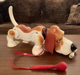 “There’s Gaylord!” I said to myself, almost out loud. I couldn’t believe it. Gaylord, built in 1962 by the Ideal Toy Company, is a sleepy-looking, brown and white, 24” long battery-operated basset hound. A loud, clumsy mechanical beast, six-year-old Billy (my mother called me Billy; don’t you call me Billy) could tug on Gaylord’s leash to get him to plod forward; another tug and he reversed course, about as gracefully as some kind of Franken-Dog. The little magnet in his nose was just strong enough to snatch up his plastic-with-a-metal-center bone if I got him to wander close enough to it. Big fun in Battery-Op Land.