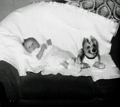 Once upon a time, I got my first toy. I’d love to tell you my brainpower enables me to remember back to that Christmas Eve, 1956. I was just under a month old, firstborn to William Norman Boggs Senior and Joan Boggs. No, of course I do not have any such memories. That’s what pictures are for. Here’s me and Rin Tin Tin. He was an early animal star in a number of movies. He died in 1932. His progeny lived on, and may still. Rin Tin Tin IV and others were cast in a TV show, “The Adventures of Rin Tin Tin” from 1954 to 1959. Rin Tin Tin was again popular in the late 50’s. That’s why my parents chose this stuffed version of the German Shepherd hero. Here he is, guarding me faithfully.