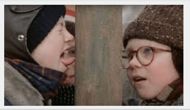 Ralphie the Narrator: Now it was serious. A double-dog-dare. What else was there but a “triple dare you”? And then, the coup de grace of all dares; the sinister triple-dog-dare.