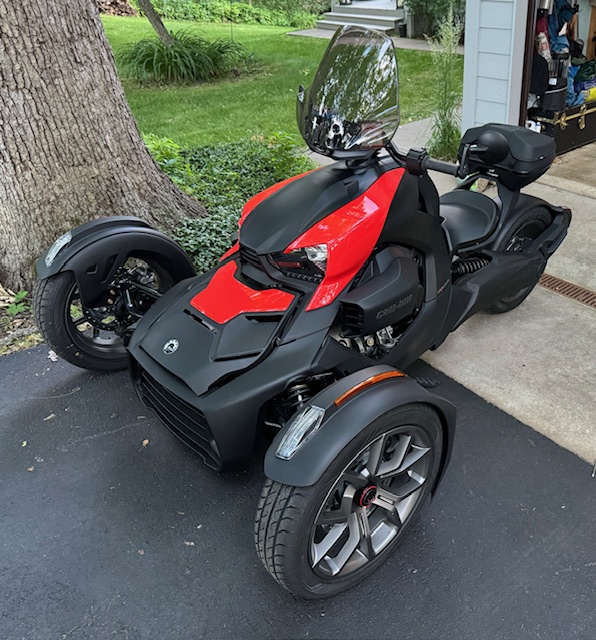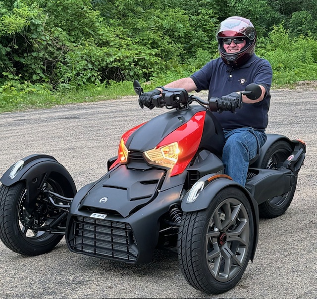 About a week later, Patty mentioned a Can Am. It’s a three-wheeler. I’ve always been interested but never tried one. I thought they were way too expensive, some costing more than our Subaru. I took a look. Went to a dealer and learned about the Can Am line. I saw a Can Am Ryker. Smaller, sportier, lots cheaper than the Spyder  . They didn’t have one I wanted. I saw an ad posted for a 2023 Ryker 900 with only 45 miles on it. Wow! Ultimately thousands less than a new one though this one was like new.